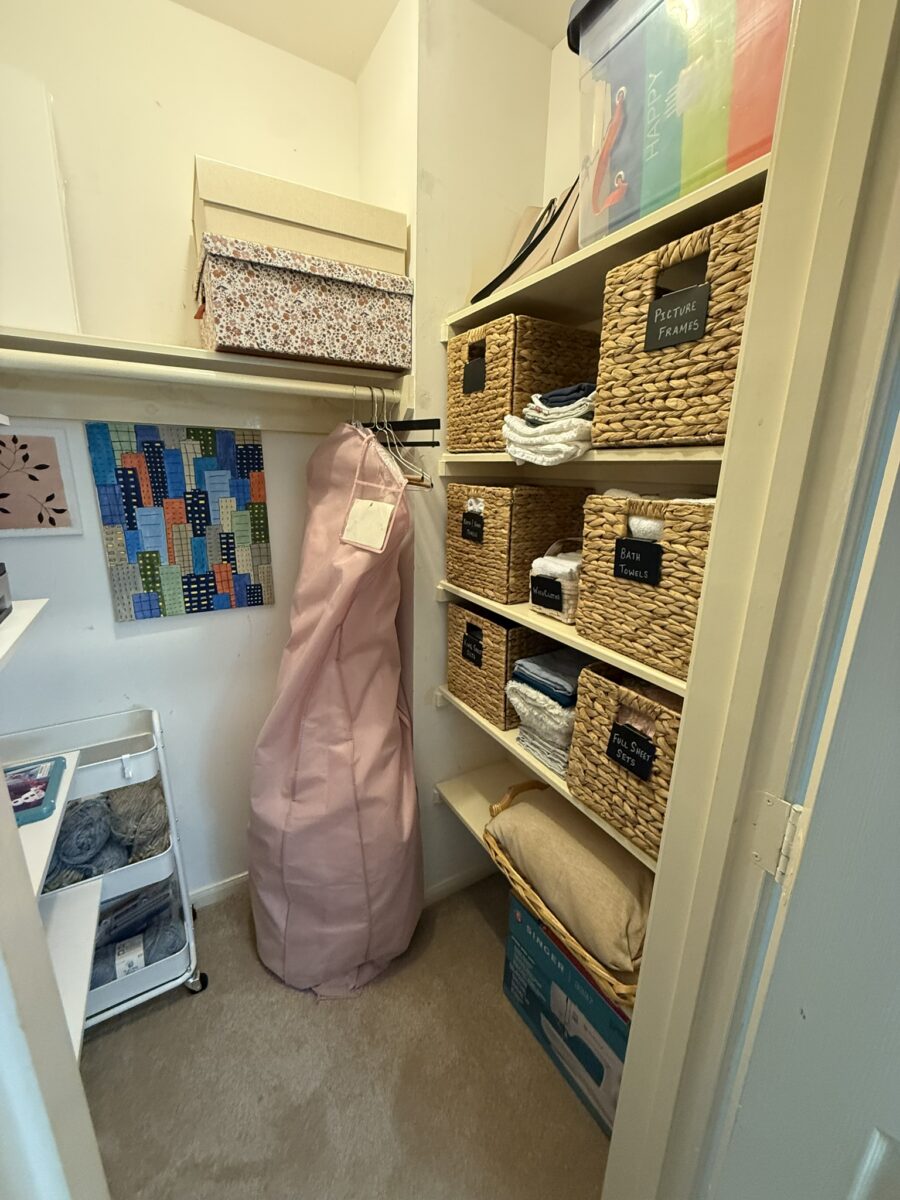 We came in and sorted and organized the contents of the closet, and built custom shelving to increase the storage space available. We also added baskets with labels to make everything easy to find and keep organized after the project was complete.